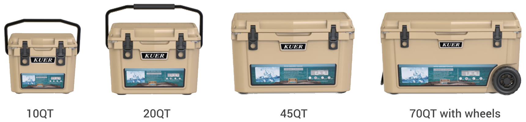 This type includes 10/20/45/60/75qt, 70/110qt with wheels. It features one more bottle opener than the 2015 model. Cancel the cup holder position on the top of the box cover, and the customized logo will be moved to the middle of the box cover, making the whole more rounded.